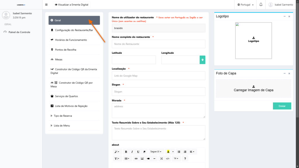 Confirme todos os campos desta secção e grave, até aparecerem todas as opções e funcionalidades do EmentaQR.pt na coluna da esquerda:
