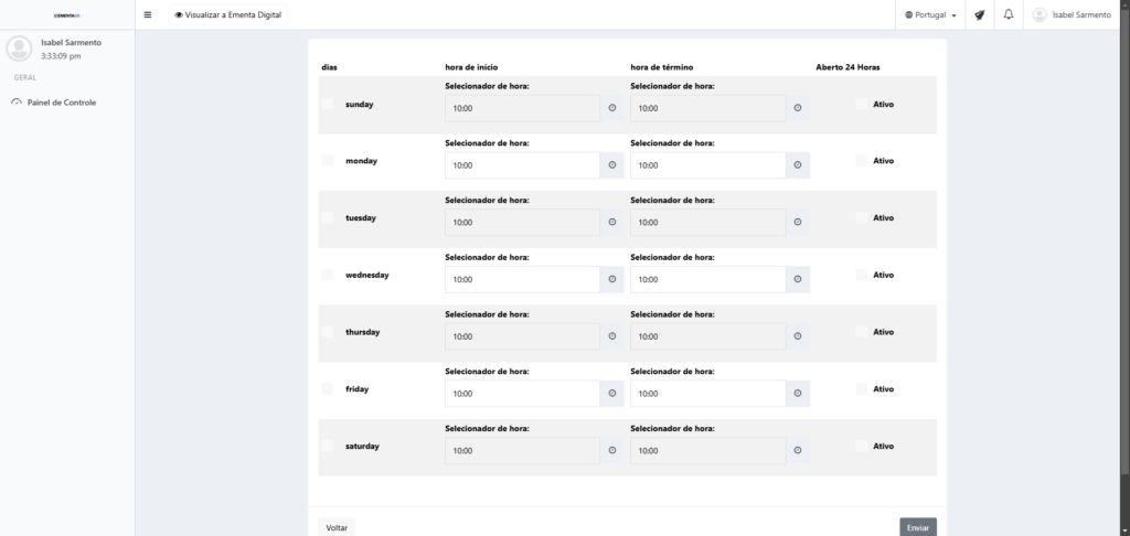 O Segundo Passo será informar ao EmentaQR.pt o horário de funcionamento do seu estabelecimento (mais tarde poderá editar este horário e até adicionar outros horários):