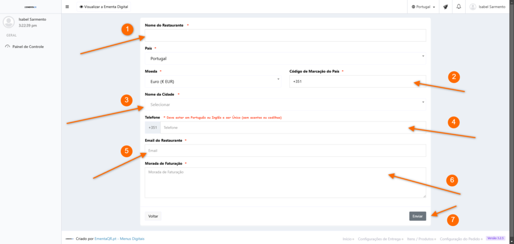 Em primeiro lugar, após verificar o seu e-mail, faça login na sua nova conta e preencha os dados sobre o seu Restaurante/Bar (o Código de Marcação do País (2) já está configurado por defeito para Portugal), para que o sistema abra todas as funcionalidades do EmentaQR.pt: