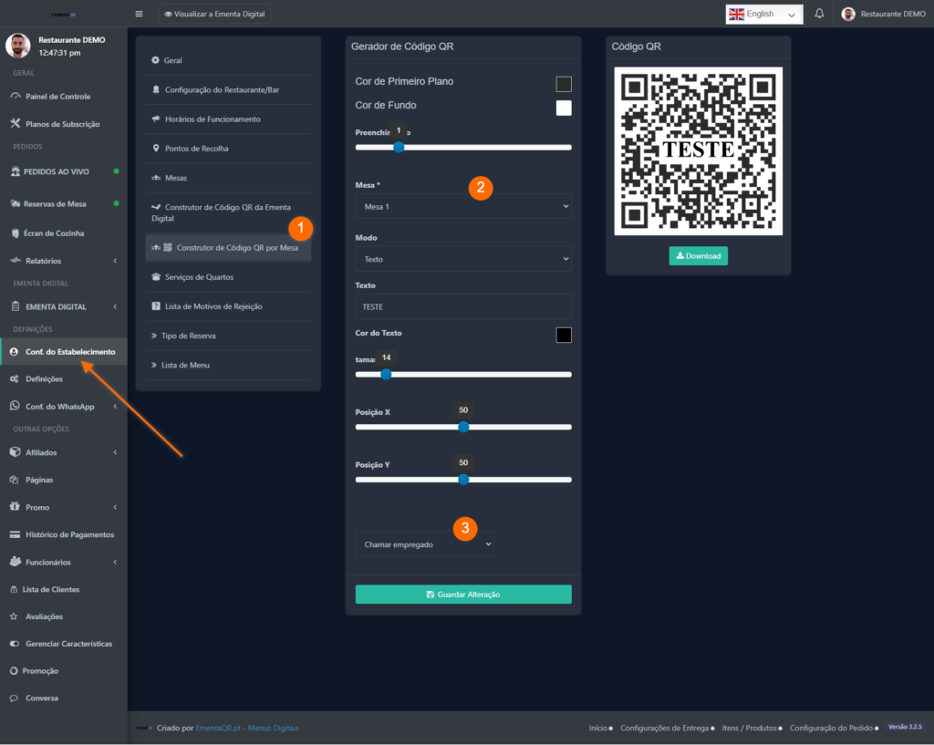 - No ecrã de criação do QR, defina a função do código: “Chamar Empregado” ou “Mesa / Comer no Local”.