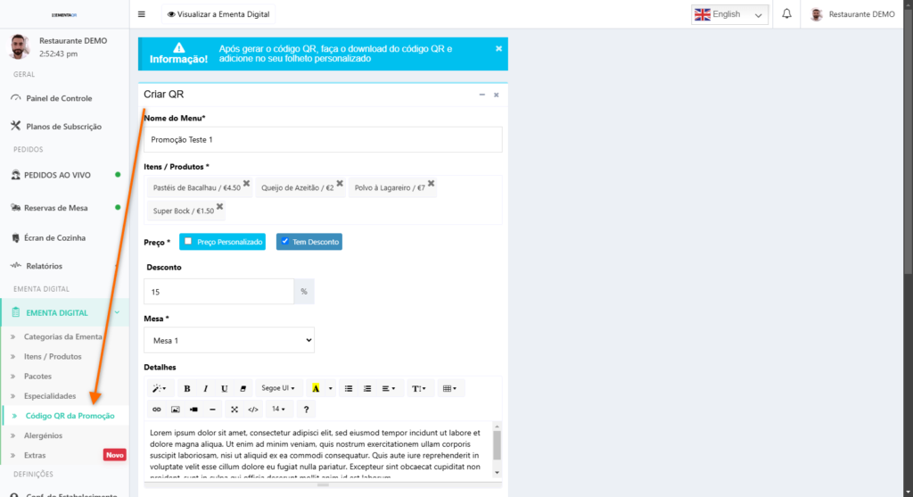 O EmentaQR.pt oferece uma funcionalidade poderosa e única: criar promoções com produtos selecionados da sua ementa, aplicando ou não descontos promocionais. Com esta opção, é possível gerar um código QR que leva os clientes diretamente à promoção, facilitando a divulgação de um grupo específico de produtos. Além disso, o QR code inclui informações da mesa, permitindo uma experiência personalizada e prática.