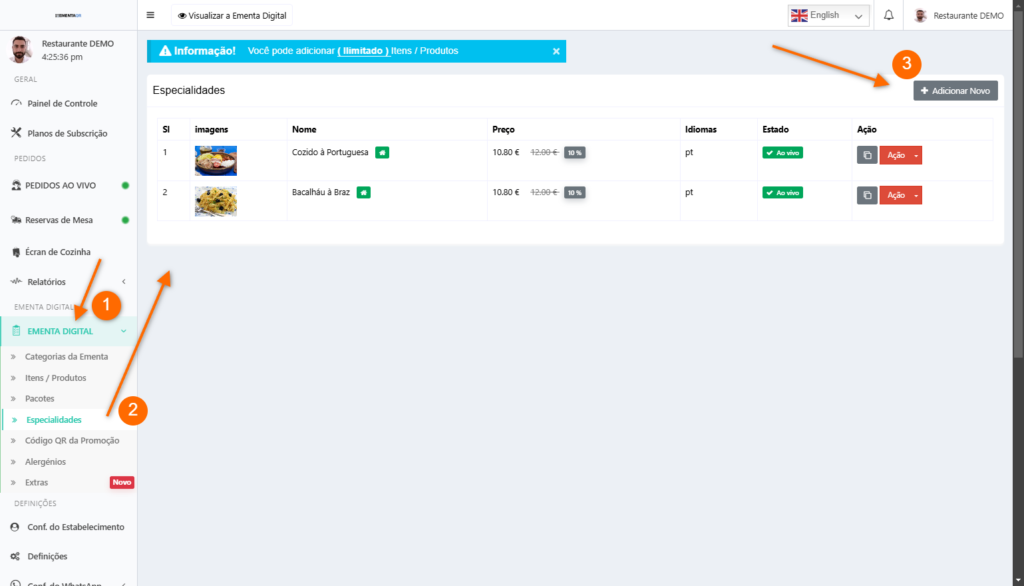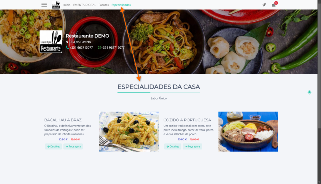 Esta opção é ideal para dar maior visibilidade aos pratos mais populares ou aos que melhor ilustram o conceito do seu restaurante. Basta selecionar os pratos que deseja listar como Especialidades, e estes estarão disponíveis numa secção própria, pronta para captar a atenção de quem visita o menu.