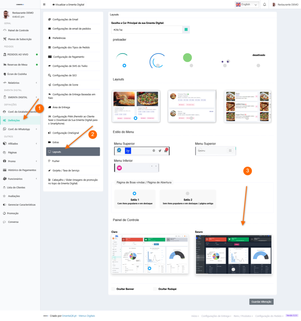 No backend do EmentaQR.pt, o operador ou proprietário também tem a opção de ativar o modo escuro. Com um simples clique no botão dedicado, pode personalizar a interface para uma experiência de gestão mais confortável, especialmente em ambientes com pouca luz, conforme ilustrado na imagem abaixo.