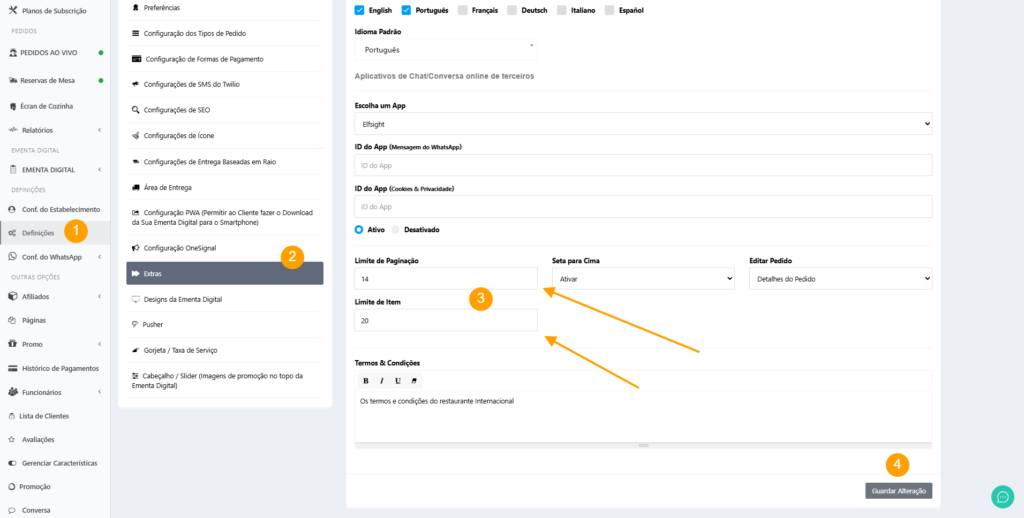 Defina quantos itens deseja exibir na sua ementa digital! Pode ajustar o limite de itens total e o número máximo por página para uma navegação mais fluida.
